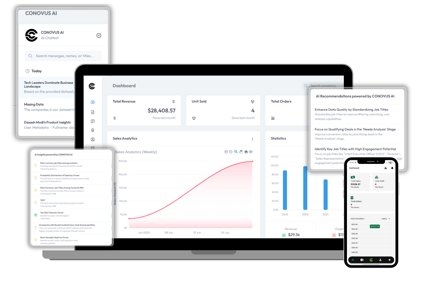 CONOVUS is an AI-powered platform that integrates with your ERP and CRM systems to deliver actionable insights, optimize operations, and drive business growth. With real-time monitoring, personalized recommendations, and an intuitive interface, it empowers smarter decision-making and